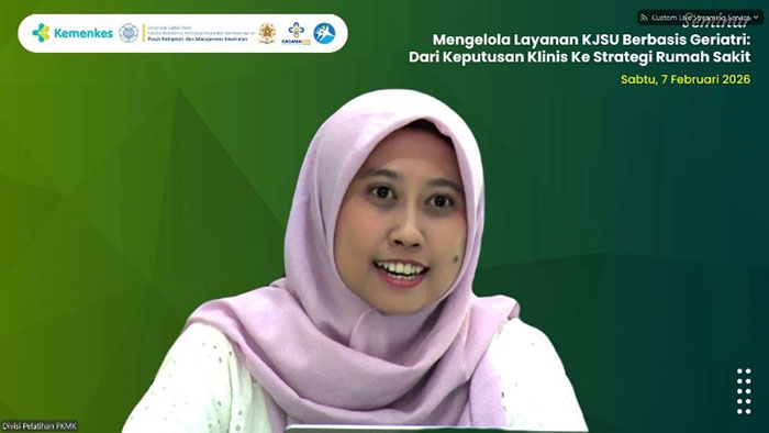 Dalam pengantarnya, dr. Lutfan Lazuardi, Ph.D. menegaskan bahwa tantangan utama KJSU bukan hanya soal keunggulan klinis, tetapi juga bagaimana rumah sakit harus siap dengan arah strategis yang akan menjadi tantangan besar. Keputusan klinis pada pasien lansia tidak semata-mata berbasis diagnosis, tetapi harus memperhatikan fungsi, kualitas hidup, dan preferensi pasien yang juga perlu dukungan sistem layanan. Disinilah titik temu yang penting yang menjembatani antara keputusan klinis dengan keputusan strategis dilevel rumah sakit.